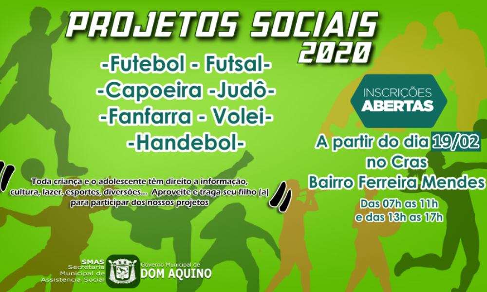 As inscrições para os projetos sociais 2020 estão liberadas a partir de hoje dia 19/02 no CRAS do Bairro Ferreira Mendes.