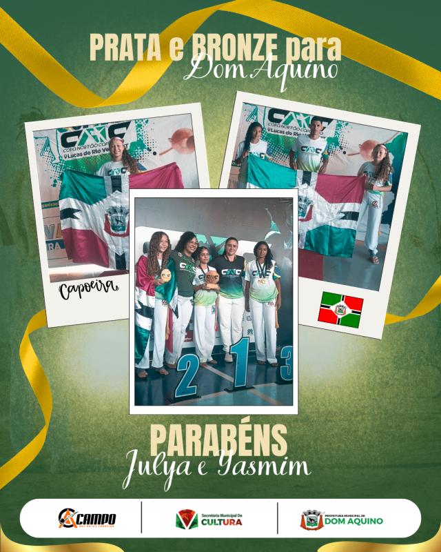 O desempenho das jovens capoeiristas é motivo de orgulho para o município e reforça a importância do investimento em projetos culturais e esportivos. A Prefeitura de Dom Aquino parabeniza os atletas, o Mestre Nego Ninja e todos os envolvidos por mais essa conquista que leva o nome da cidade a patamares cada vez mais altos.